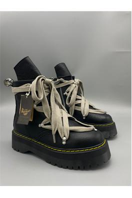 個人的には軍用ブーツのような履き心地で、若い世代に好まれそうな印象があります。 デザイン全体を見ると、まずアッパー(甲部分)はドクターマーチン伝統のオリジナルレザーをベースにしつつ、 リックオウエンス特有の感性が加わり、マットでややテクスチャー感のある仕上がりになっています。