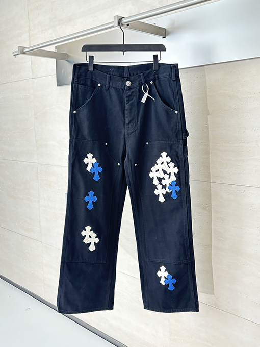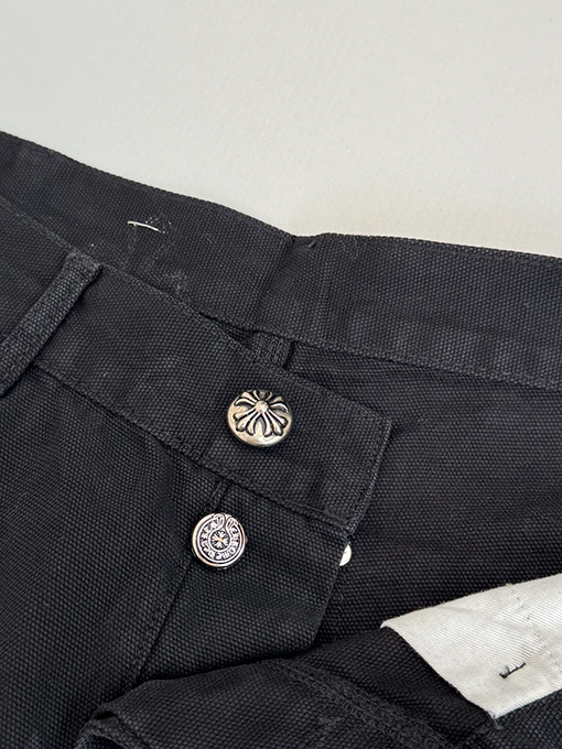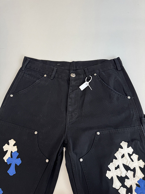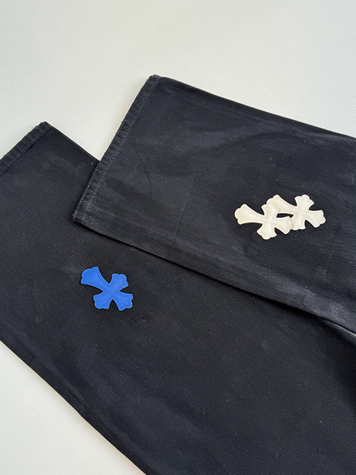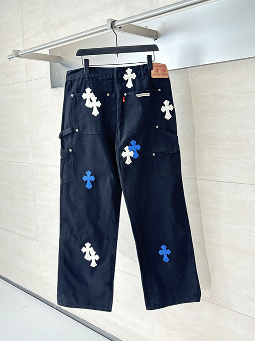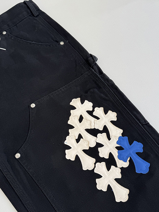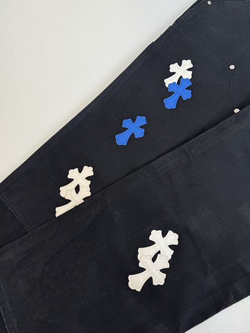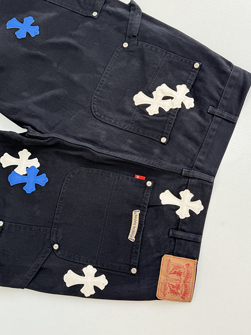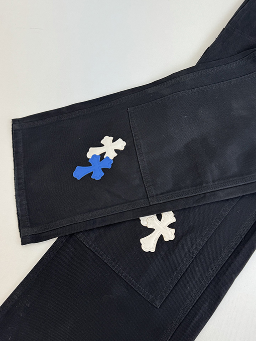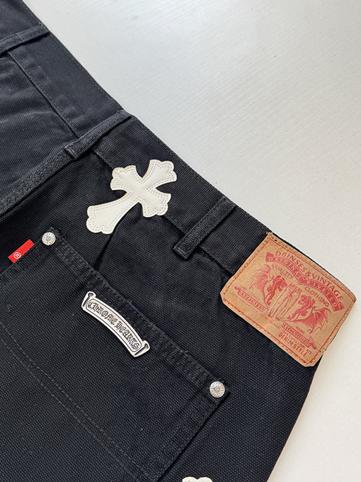 商品说明 | クロムハーツ25コレクションのキーピースであるこのブロックレザーワークジーンズは、ブランドの反骨精神と精緻な職人技を体現し、ラグジュアリーなストリートウェアならではの魅力を放ちます。ハイオンスのウォッシュ加工ツイルデニムを使用し、カスタム織りと染色で仕上げたこのジーンズは、肉厚でハリがありながらも快適なフィット感を提供します。幾度ものウォッシュ加工と磨き加工により、ストリートウェアにインスパイアされた、時代を超えた独特の風合いが生まれます。 |