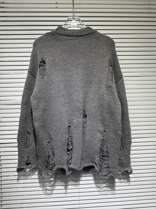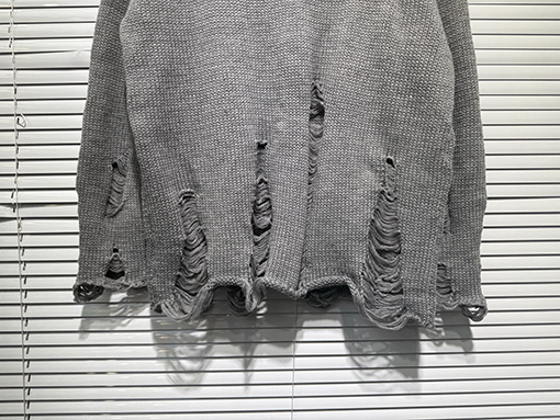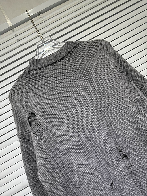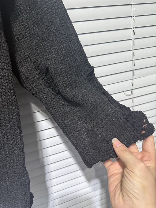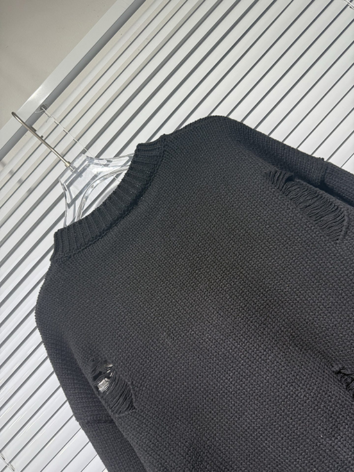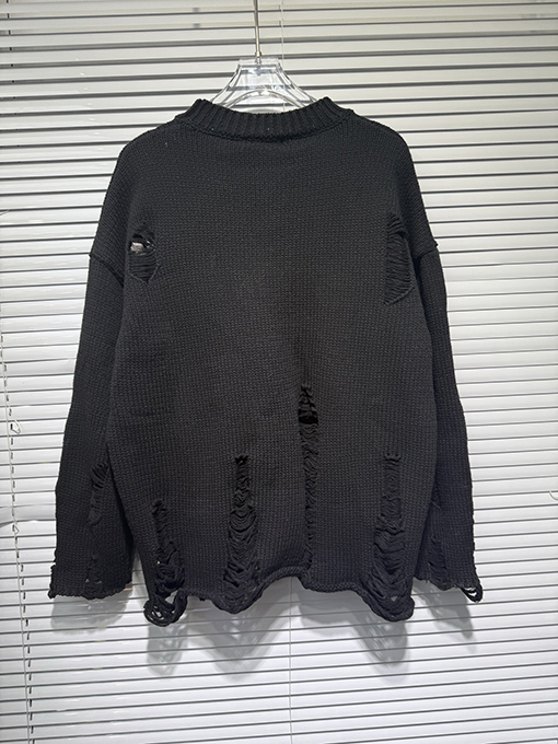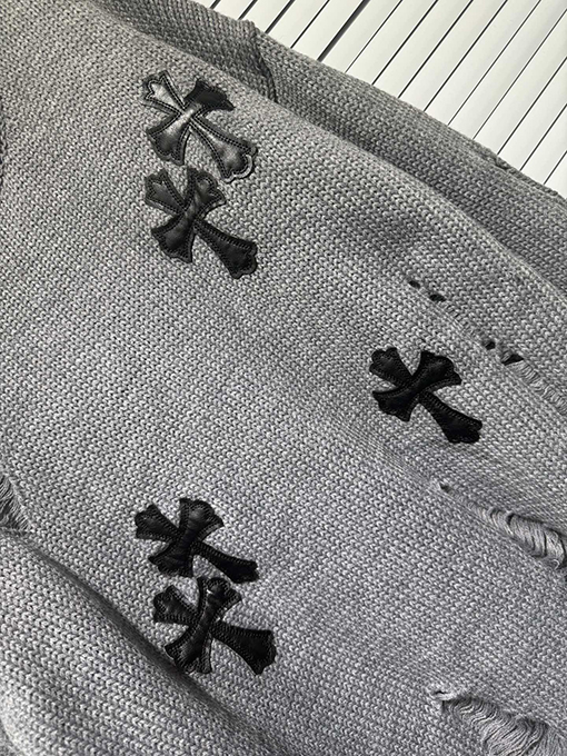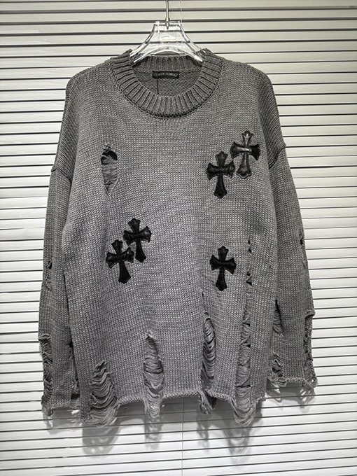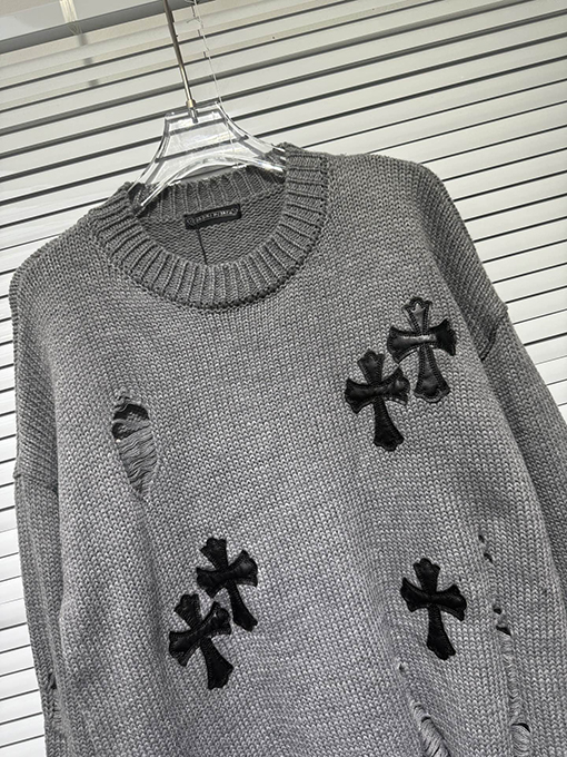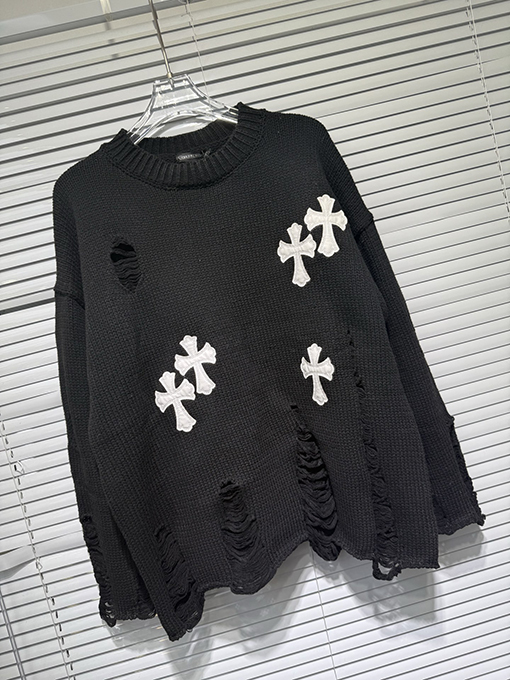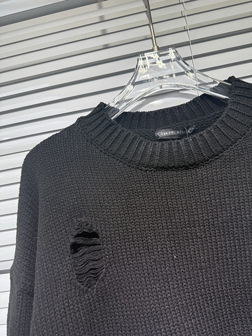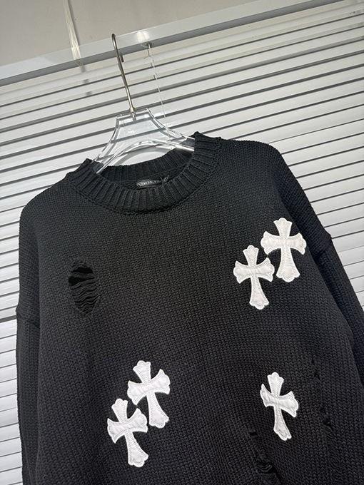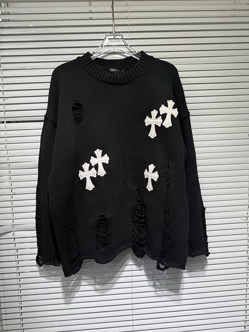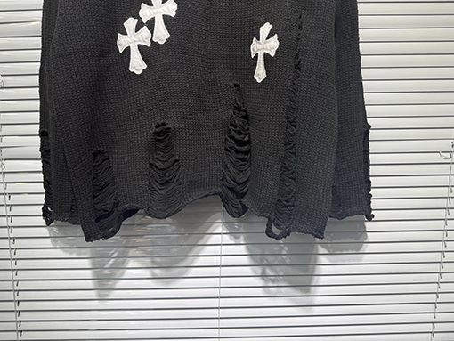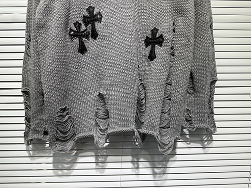 商品说明 | 輸入ピュアコットン糸を機械織りで仕上げたこのセーターは、上質な風合いと通気性、快適な着心地、そして上質な肌触りを兼ね備えています。不規則な手作業で切り抜かれた穴など、細部にまでこだわったデザインが、大胆な個性と気ままな雰囲気を醸し出します。胸元とボディにはレザークロスの刺繍が施され、高精度なステッチと立体感を演出しています。ラフさと洗練さが絶妙なバランスで融合し、クロムハーツのシグネチャーである「ダークラグジュアリー」スタイルを体現しています。 |
