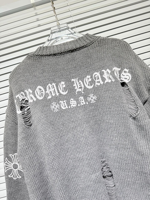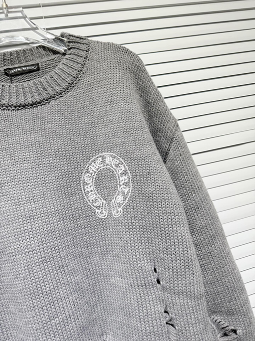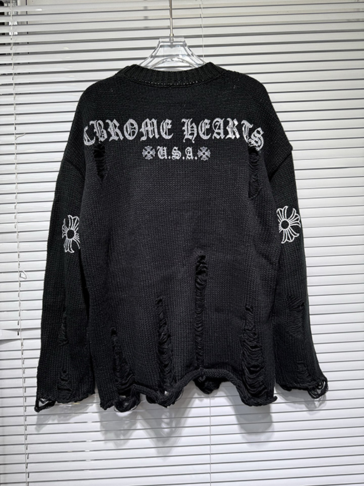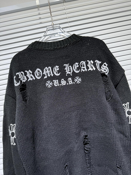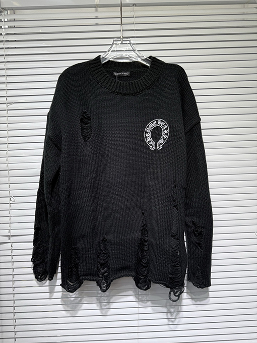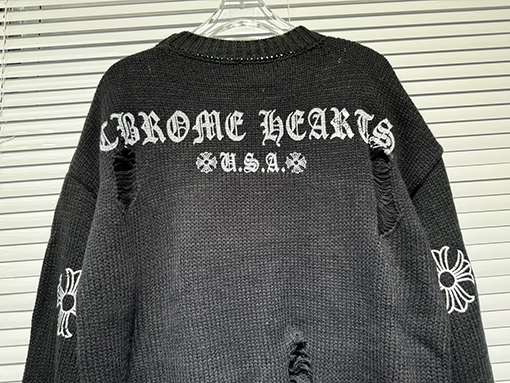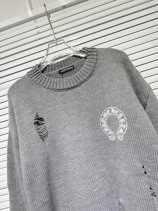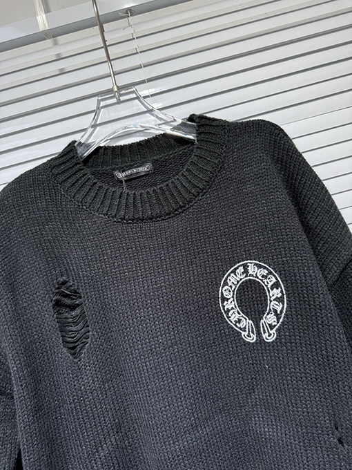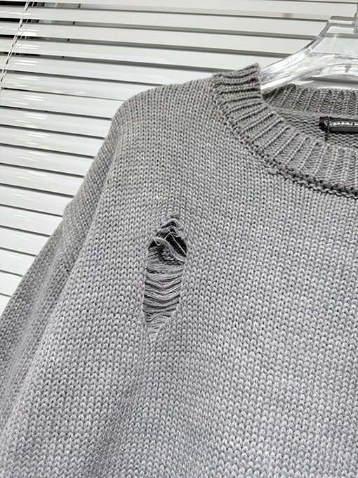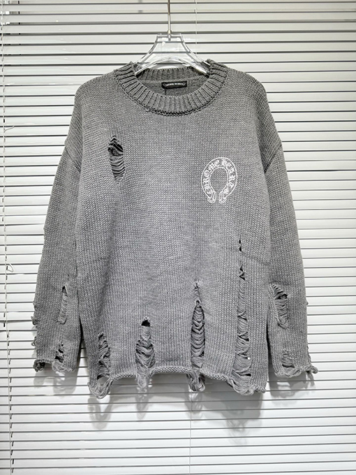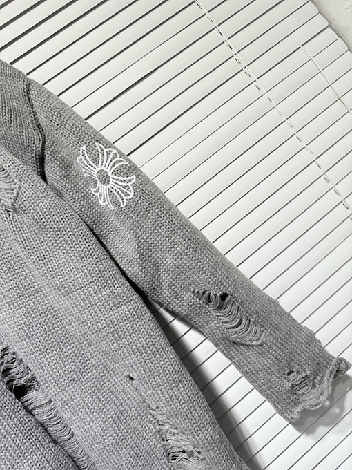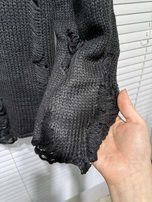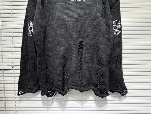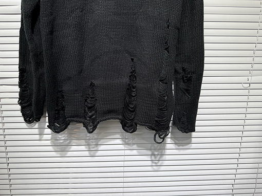 商品说明 | 不規則に裂けた穴が特徴的なこのセーターは、時の痕跡を彷彿とさせ、退廃的な美学と独特のアティテュードを想起させます。さらに、精緻な針仕事で仕上げられたサンスクリット語の馬蹄プリントの刺繍が施され、東洋の神秘的なシンボルと西洋のストリートウェアがシームレスに融合し、豊かで個性的なデザインに仕上がっています。 |