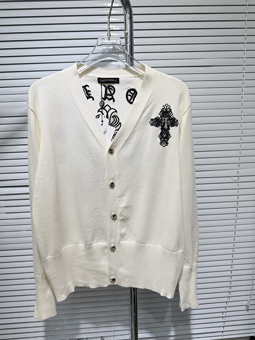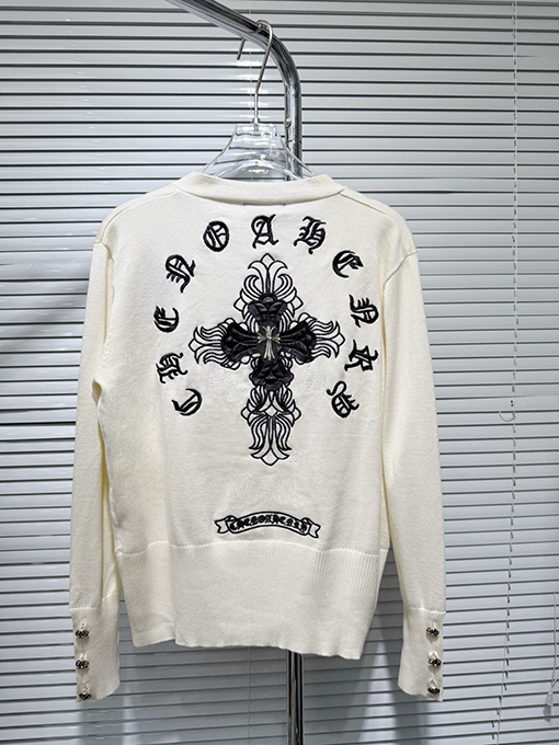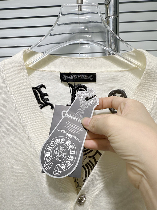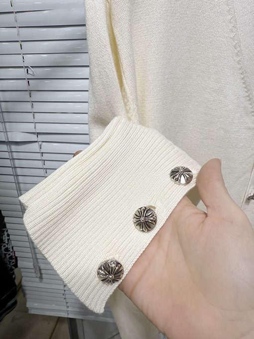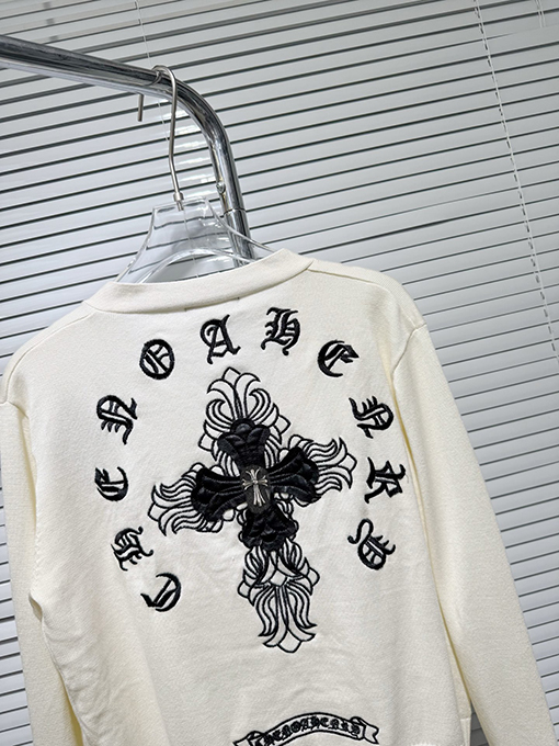 商品说明 | このカーディガンセーターは、1万針の刺繍技術を採用しています。細かく均一なステッチと正確な針配置が、立体的で繊細な視覚効果を生み出しています。遠くから見ても近くから見ても、その職人技は完璧です。刺繍とニット地のシームレスな融合が、レイヤード感と独特の風合いを生み出し、クロムハーツならではの高級感とハードコアな美学を完璧に表現しています。 |
