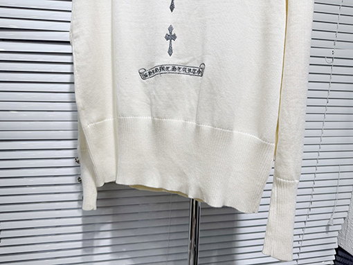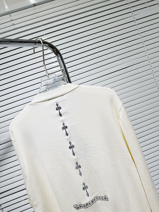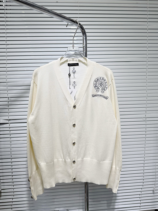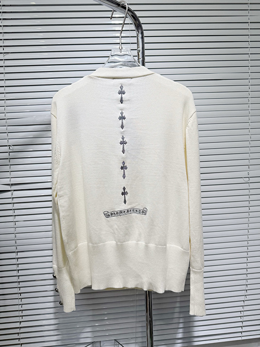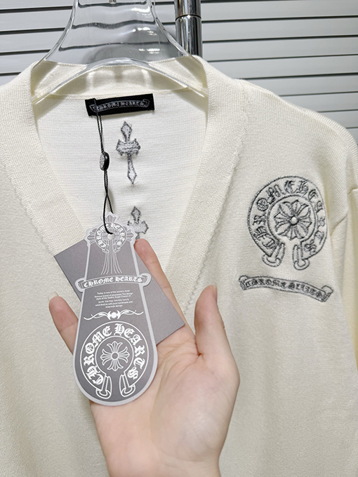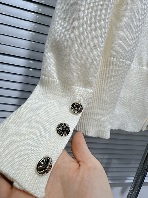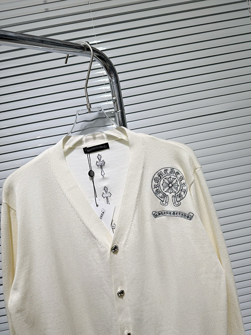 商品说明 | 輸入純綿糸を機械織りで仕上げたカーディガンは、柔らかく肌に優しく、通気性とシャリ感を兼ね備えています。温かさと実用性を兼ね備えているだけでなく、ニット特有の質感が立体感を生み出します。アームにはジャカード柄と馬蹄プリントが施され、精密な刺繍と細部へのこだわりが光ります。クロムハーツのクラフトマンシップへのこだわりと、その力強さが存分に表現されています。 |