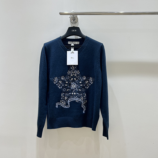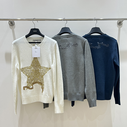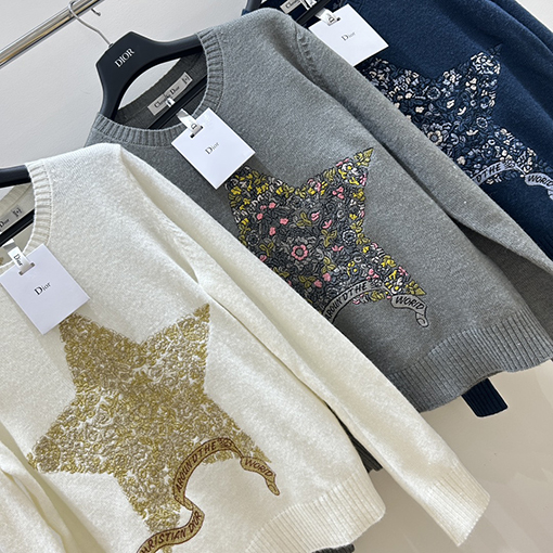 商品说明 | ディオールは、シンプルさとラグジュアリーさを融合させた、一目でそれと分かる刺繍セーターを披露しました。全体的にミニマルなデザインでありながら、個性的なディテールがエレガンスを高めています。セーターのフロントには繊細な星と花の刺繍が施され、自然とロマンチックなイメージを巧みに融合させ、セーターを流れるようなキャンバスへと昇華させています。 |
