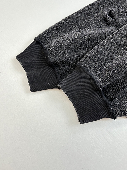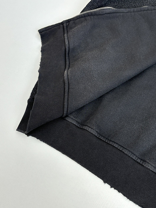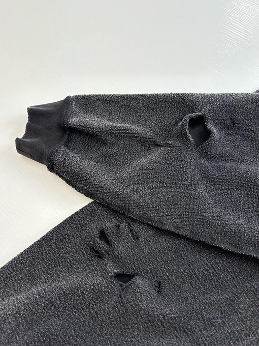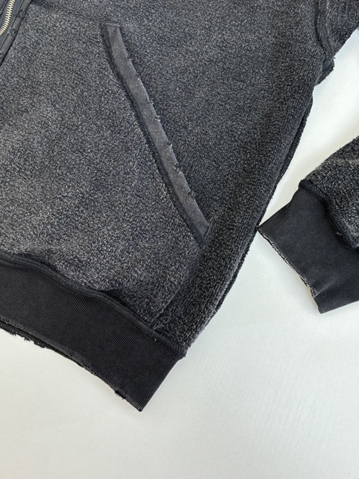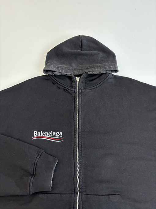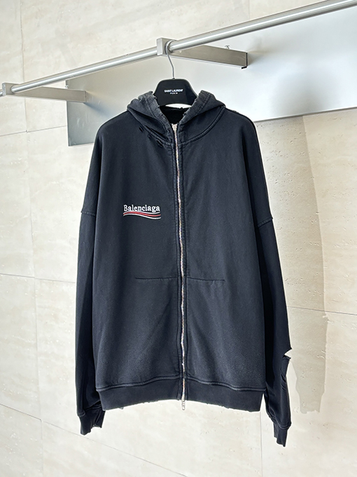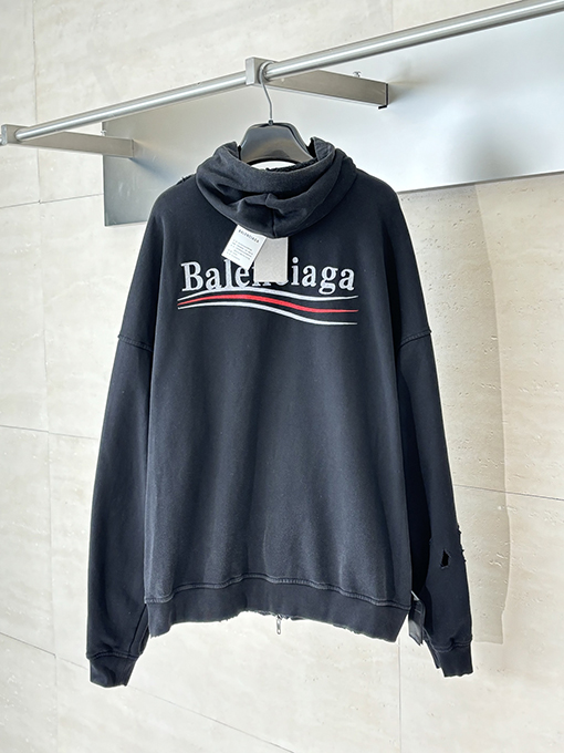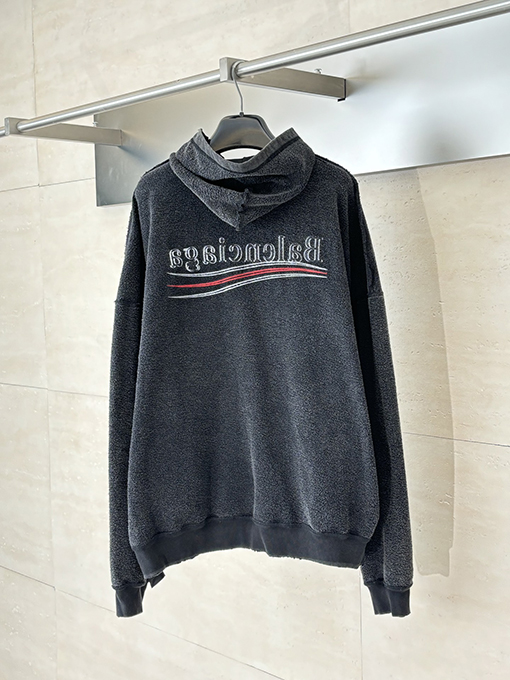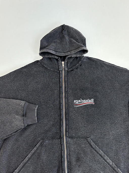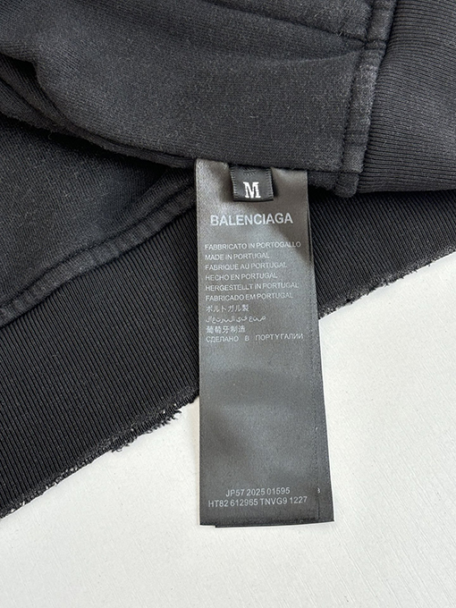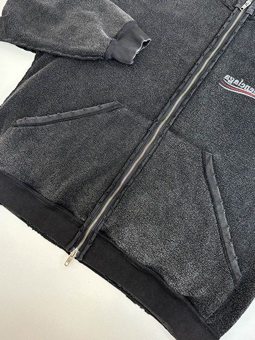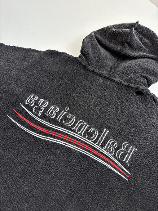 商品说明 | ウォッシュ加工とサンドフライ加工を施したダメージ加工により、柔らかく肌触りの良い風合いと、ナチュラルでヴィンテージな色合いが生まれています。また、熟練の職人が丁寧に手作業でほつれ加工を施したディテールが全体に施されています。それぞれのディテールが、独特の重層的な質感と、さりげなくアーティスティックな雰囲気を醸し出しています。ほつれながらも整然としたこの美学は、バレンシアガの特徴であるアヴァンギャルドで退廃的な美学を体現しています。 |