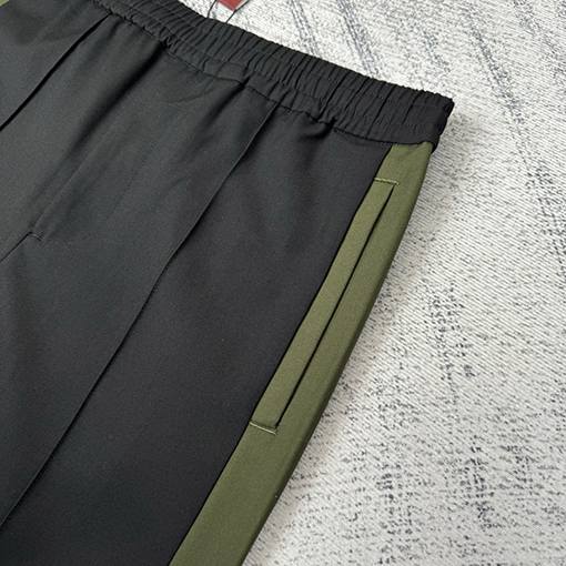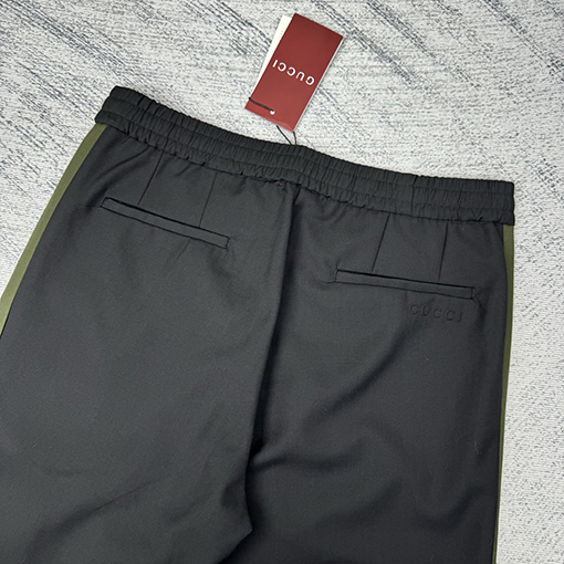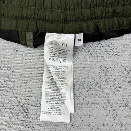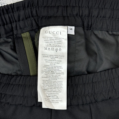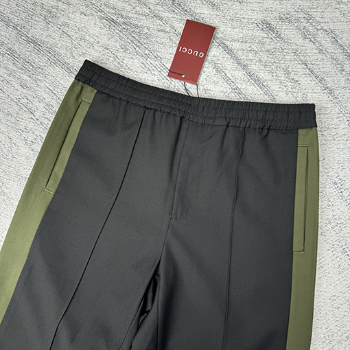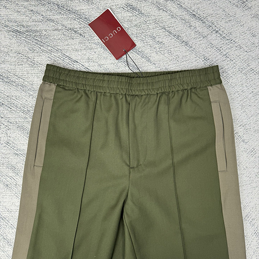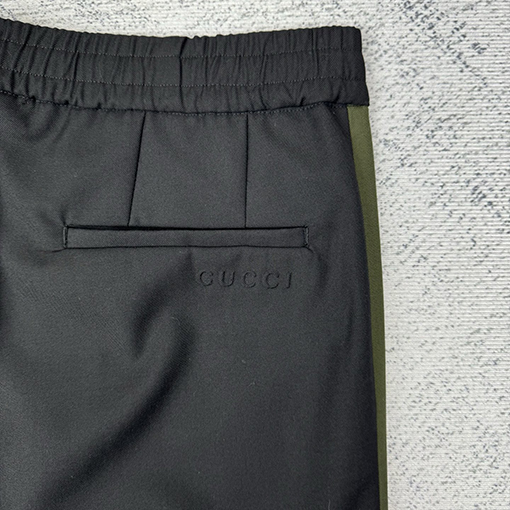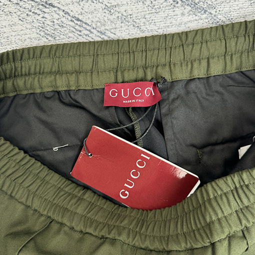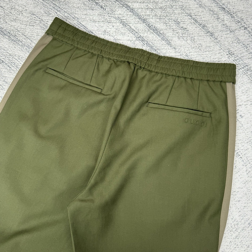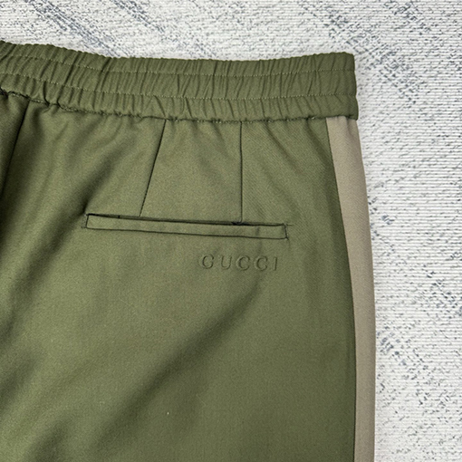 商品说明 | グッチのアーミーグリーンのカラーブロックカジュアルパンツは、ミリタリースタイルとモダンなストリートウェアのトレンドを巧みに融合させ、上質なデイリーアイテムへと昇華させています。アーミーグリーンのメインカラーとカラーブロックのディテールを巧みに組み合わせたデザインが際立ちます。サイドとポケットにあしらわれたコントラストカラーのアクセントが、視覚的な奥行きとダイナミックな雰囲気を演出し、全体のルックをさらにファッショナブルに仕上げています。 |