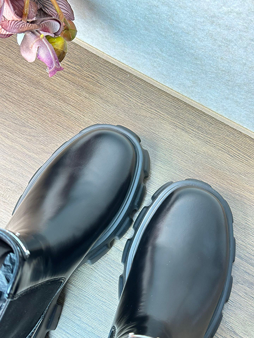 プラダのブルドーザープラットフォームシューズは、一目でそれと分かる厚底ソールとアバンギャルドなデザインで、今シーズンの注目の的となっています。輸入された滑らかな牛革を使用し、豊かで彫刻的なシルエットと、しっかりとした作りが特徴です。厚手のラバーソールは、高さをプラスし、快適な履き心地と優れた滑り止め効果をもたらします。