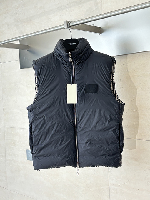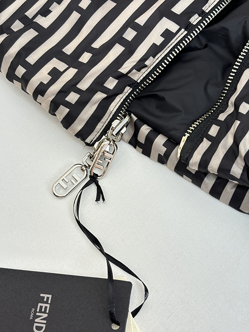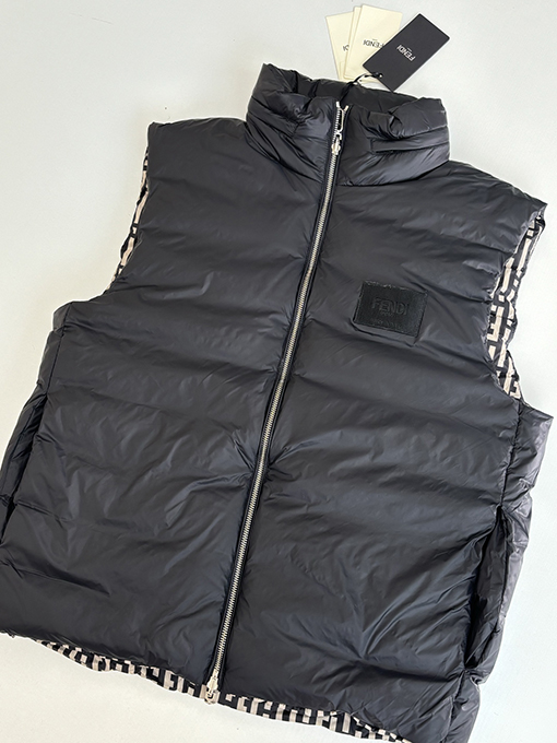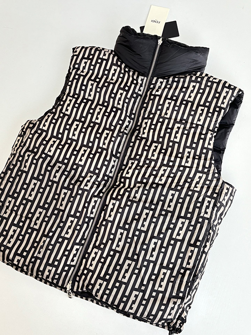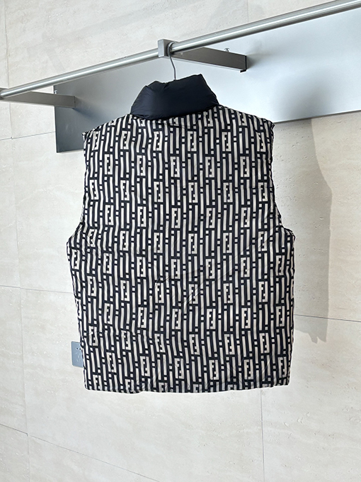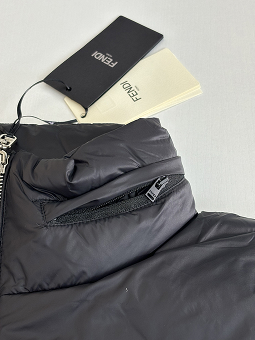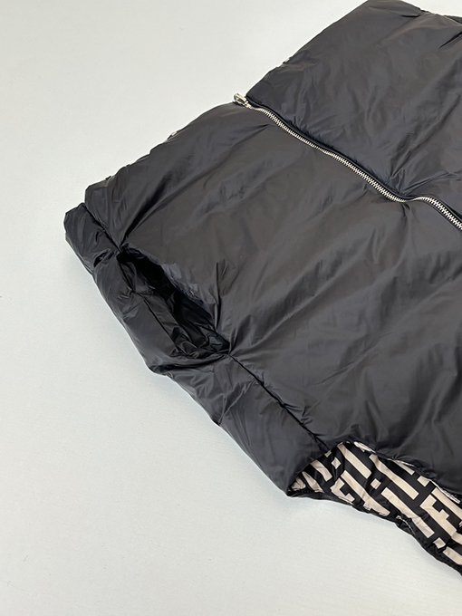 商品说明 | ステファノ・ピラーティがデザインを手掛けたフェンディのハイエンドコレクションから、リバーシブルダウンベストが登場。ブランドを象徴するFFストライプと、モダンで都会的な機能美が見事に融合しています。まさにイタリアのラグジュアリーと実用性を体現した逸品です。ミッドナイトブルーの高密度ナイロンを使用し、軽量で防風性と撥水性に優れた素材で仕上げ、さらりとした着心地と快適な着心地を両立しています。 |