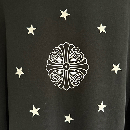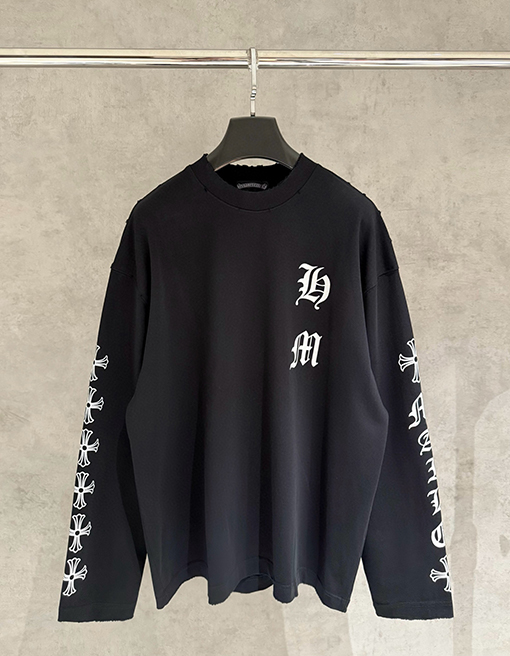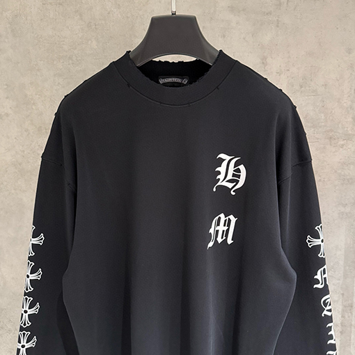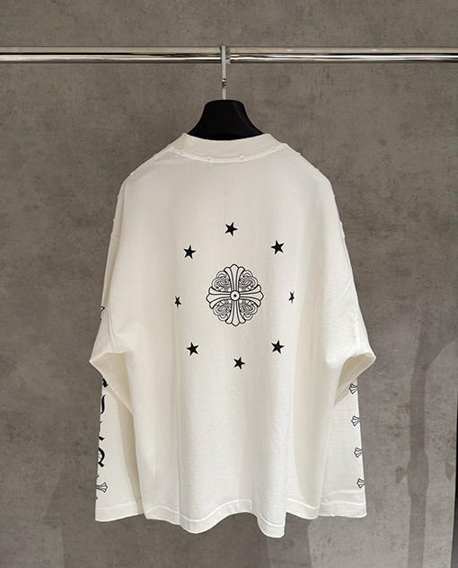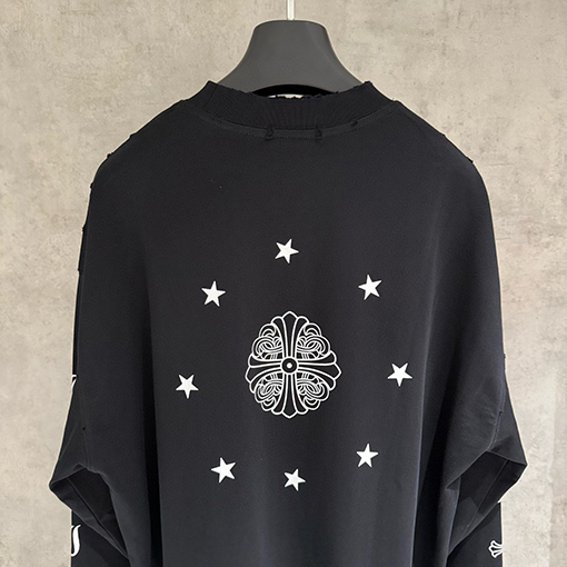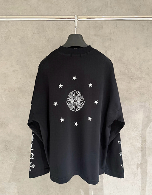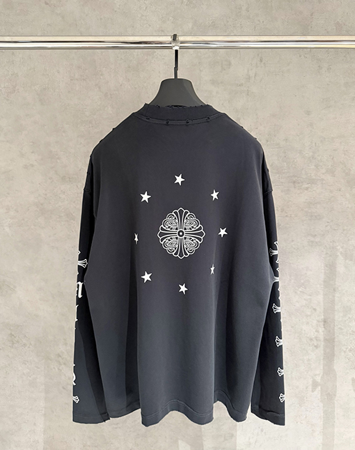 商品说明 | クロムハーツのヘビーウェイトなロングスリーブスウェットシャツは、ブランドの反骨精神と洗練されたストリートウェア精神を継承し、質感とアティテュードを融合させた秋冬ファッションのエッセンシャルアイテムを再定義します。シャープでクリーンなカットのトップスは、力強いシルエットを自然に作り出し、さりげなくハイエンドなストリートウェアの雰囲気を醸し出します。ダブルウォッシュ加工により、より柔らかく洗練された風合いが生まれ、しなやかでリッチなレイヤード感を醸し出します。 |