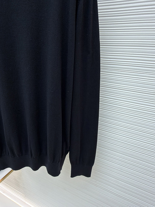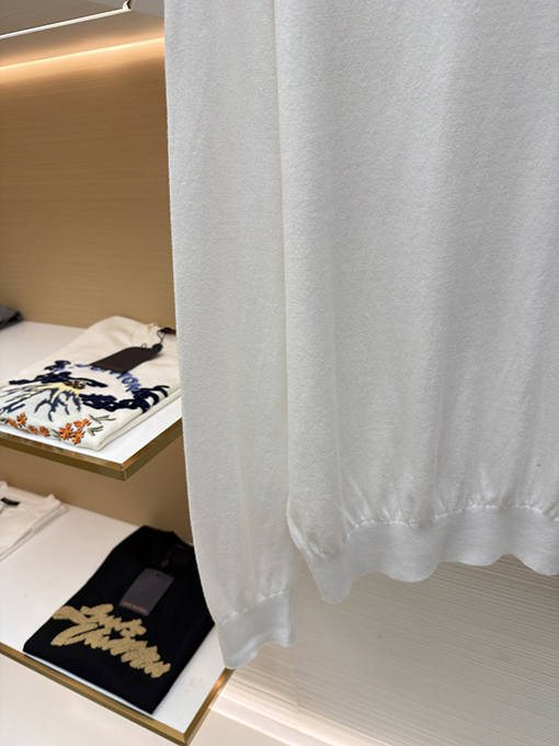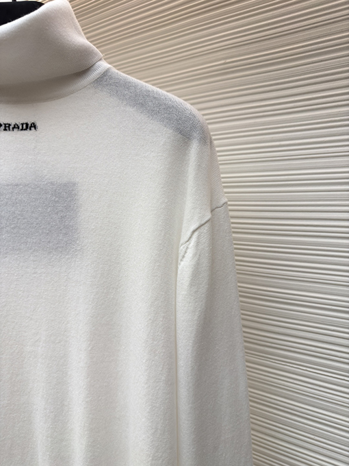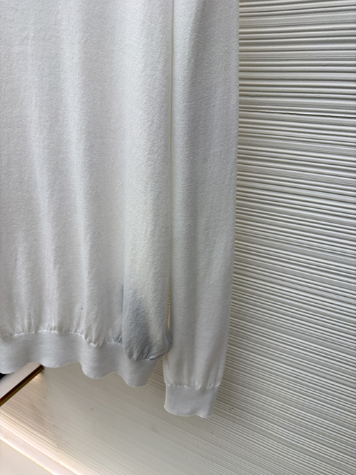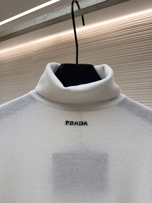 | 商品说明 | このセーターは、特注で織られたシルケット加工の梳毛ウール生地で仕立てられており、柔らかく繊細な手触りで、肌に触れると軽やかに、そしてほのかな光沢を放ちます。純白の色合いは抑制と均衡を象徴し、繊細な織りは光の下で流れるような重なり合う効果を生み出し、ミニマルなデザインでありながら単調さを感じさせません。ブラックのプラダロゴジャカードは、黄金比のポイントである鎖骨の下に正確に配置され、静謐でありながら力強く、控えめなエレガンスの中にハイファッションのオーラを放ちます。 |