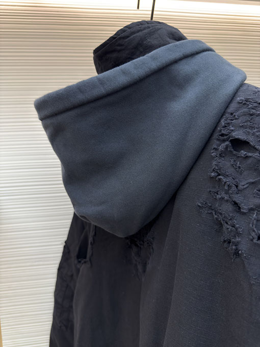 | 商品说明 | バレンシアガのダメージ加工とウォッシュ加工を施したコットンジャケットは、デムナの最も象徴的な作品と言えるでしょう。デコンストラクション、ダメージ加工、ウォッシュ加工、そして極限のエイジング加工を融合させ、「ダーティフィット」の美学を完璧に体現しています。ジャケット全体は特注の高密度ピュアコットン生地を使用し、手作業によるダメージ加工と重厚なダメージ加工を施すことで、独特の着古したような風合いを実現しています。