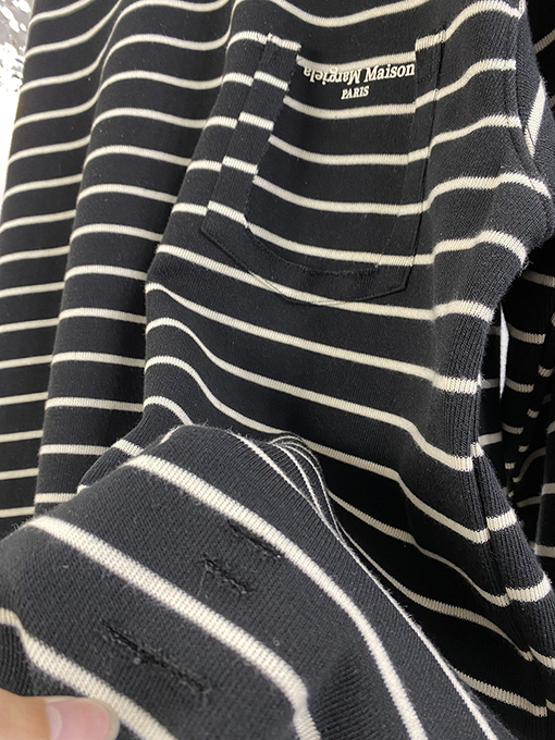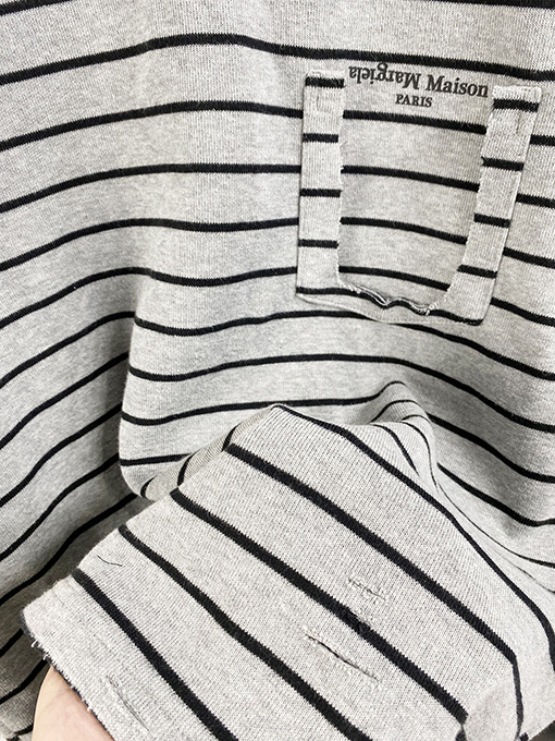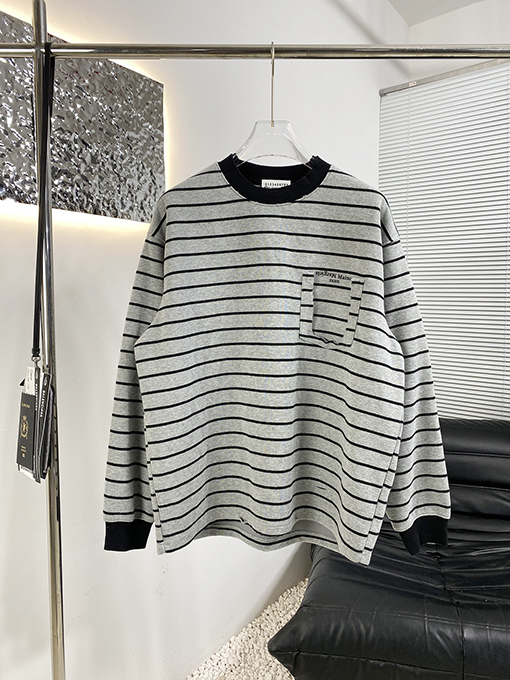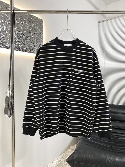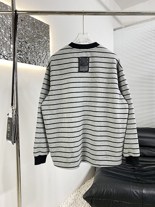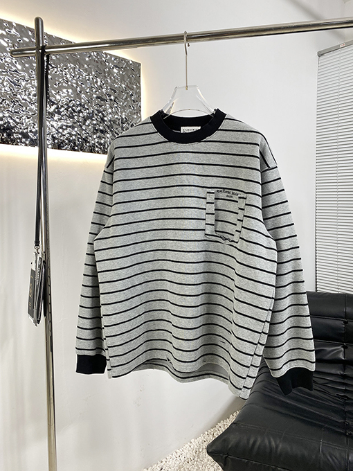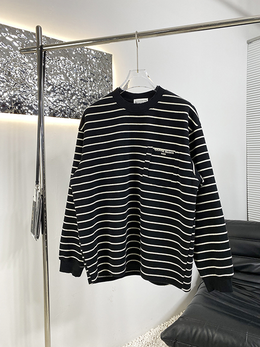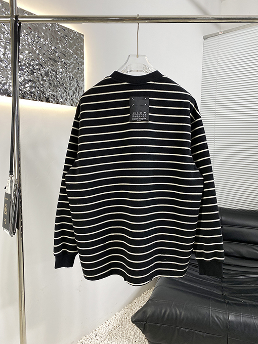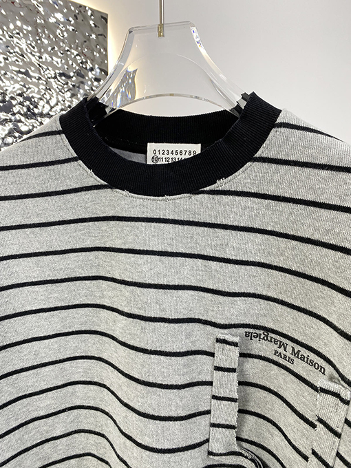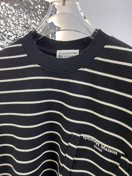 | 商品说明 | マルジェラの新作ストライプスウェットシャツは、フェイクポケットが特徴で、ブランドの特徴である洗練されたミニマリズムの哲学をスタイリッシュでカジュアルなアイテムに落とし込んでいます。シンプルなストライプを全体にあしらったデザインに、フェイクポケットが遊び心と視覚的な奥行きを添えています。ネックラインのコントラストのあるリブ編みのディテールが、クラシックなスタイルの存在感とトレンド感をさらに高めています。